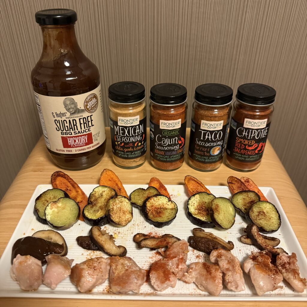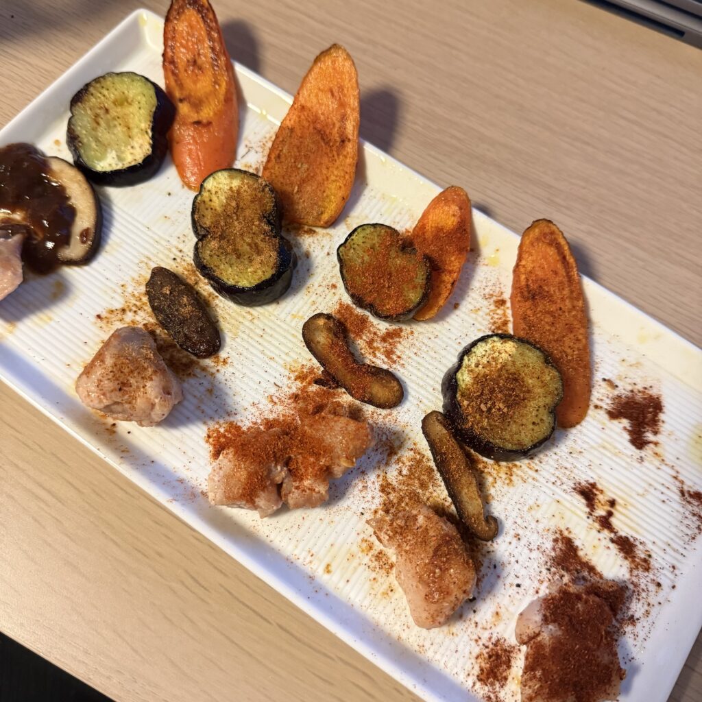 鶏肉、しいたけ、ズッキーニ、ニンジン(すべて焼いたもの)にかけて食べ比べ。