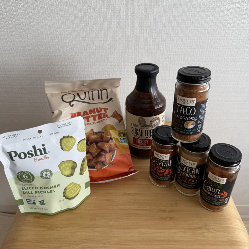 今回買ったのは、シーズニング4つ、BBQソース、ピクルス、プレッツェル。