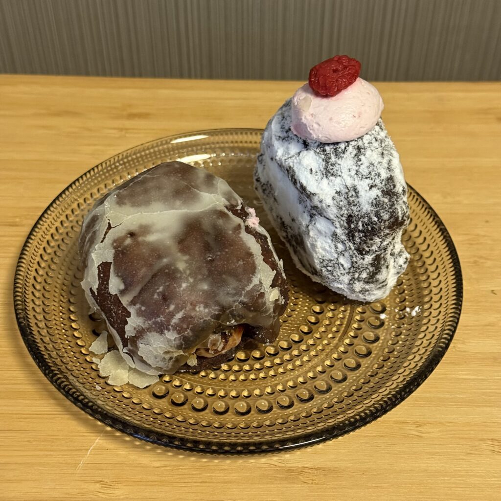 ソーセージ入りドーナツと、フランボワーズのドーナツ。
