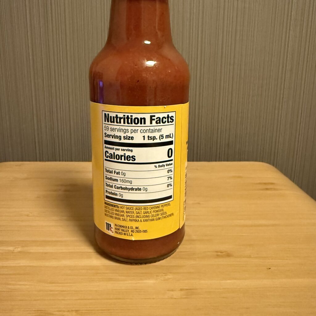 Hot sauce (aged red cayenne peppers, distilled vinegar, water, salt, garlic powder), distilled vinegar, spices (including celery seed), mustard bran, salt, paprika & xanthan gum (thickener).