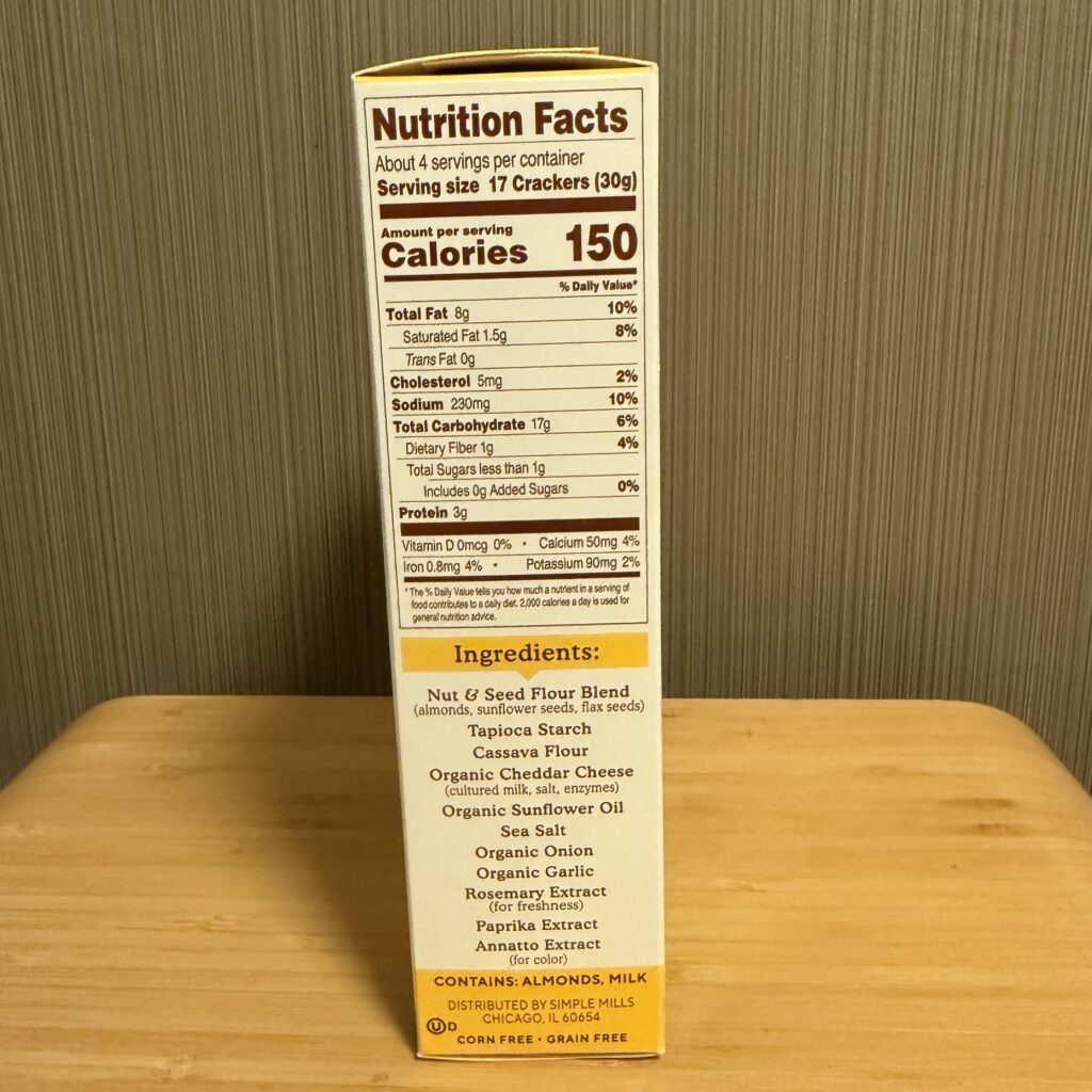 タピオカ、キャッサバ、有機チェダーチーズ(養殖ミルク、塩、酵素)、有機ひまわり油、海塩、有機玉ねぎ、有機ニンニク、ローズマリーエキス(新鮮なもののための)、ナッツと種粉ブレンド(アーモンド、ヒマワリの種、亜麻の種) 、パプリカ&アナットエキス(カラー用)。